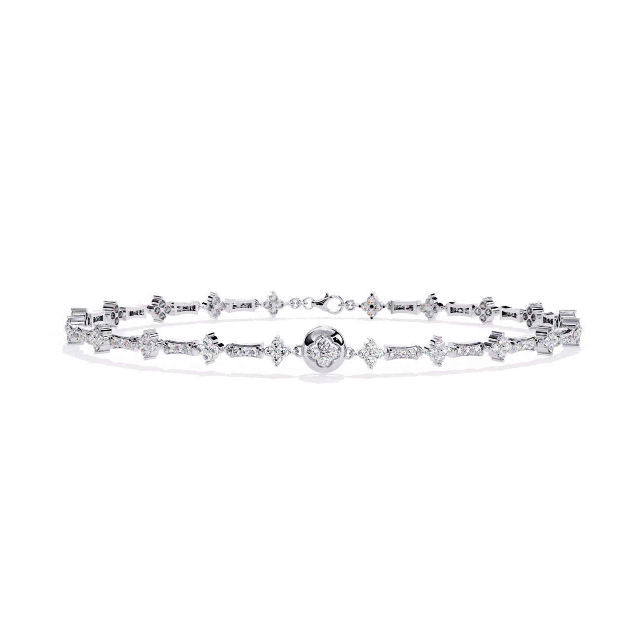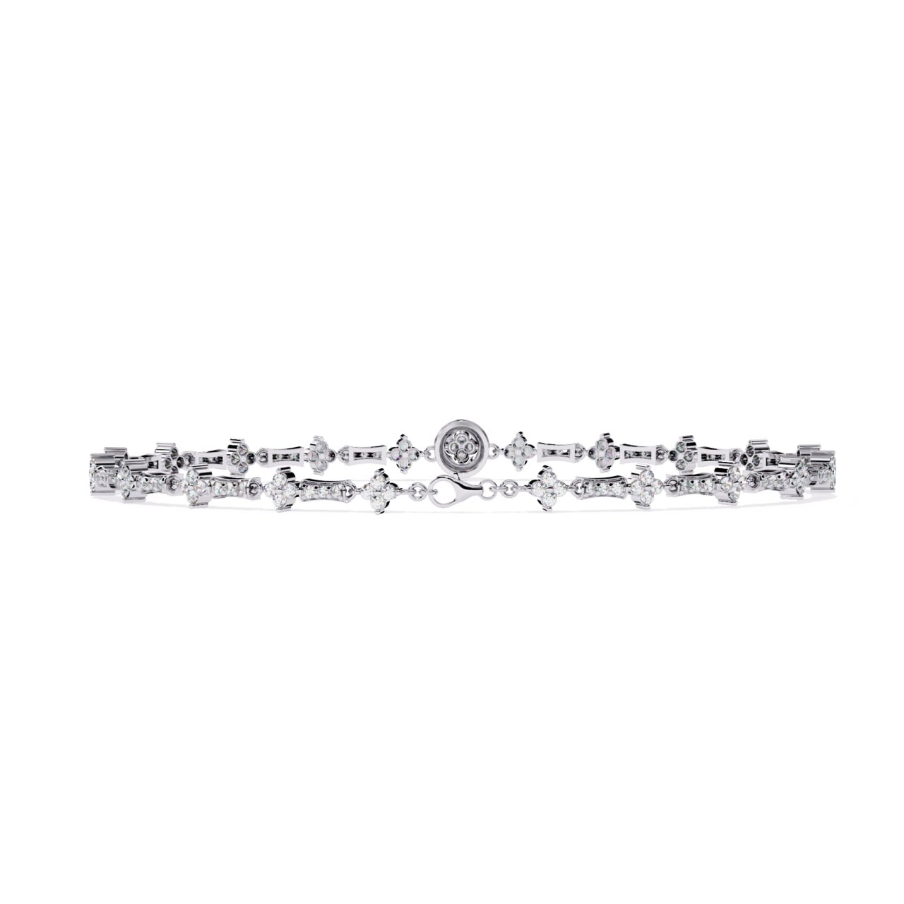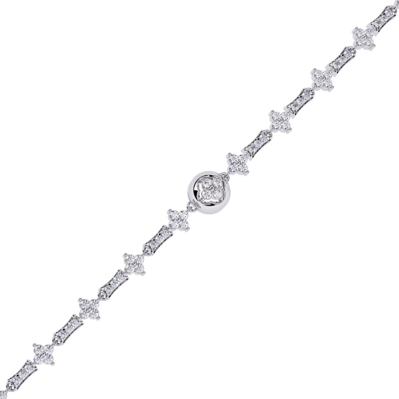 SKU : B001A refined diamond station bracelet featuring elegant floral-inspired links and a prominent round floral centerpiece. Designed with alternating diamond-set elements, this bracelet delivers continuous sparkle while maintaining a lightweight and wearable profile. The symmetrical layout and soft curves make it ideal for everyday luxury as well as special occasions. A perfect blend of modern craftsmanship and timeless design.