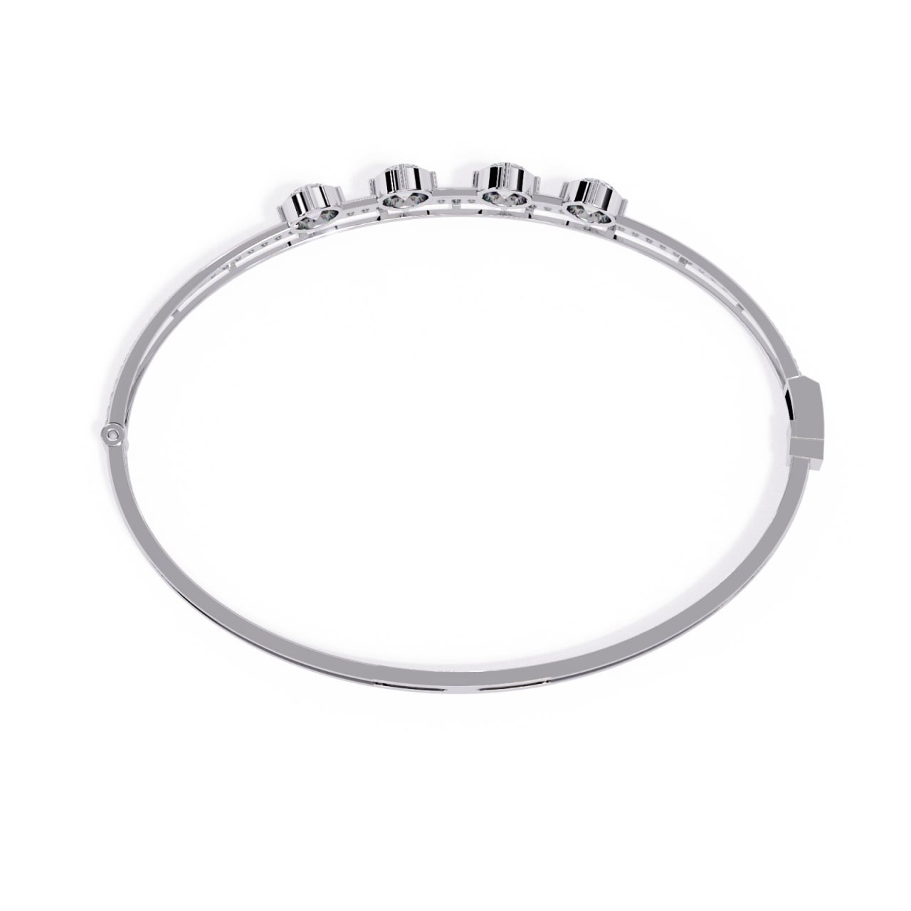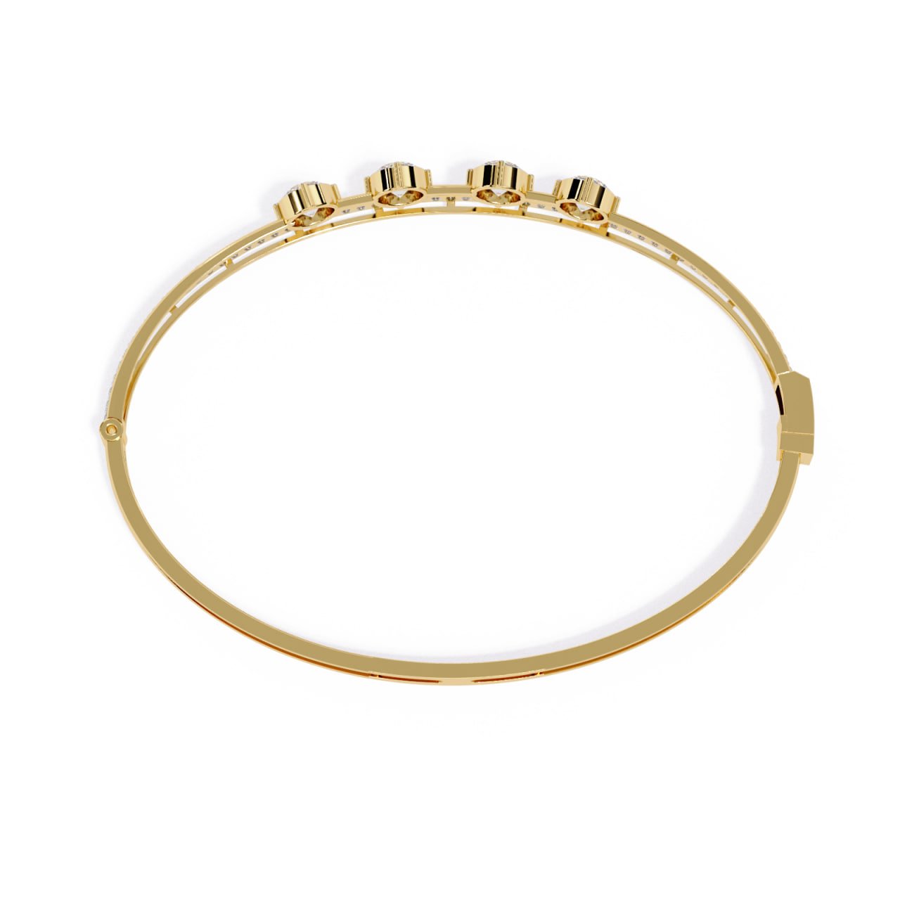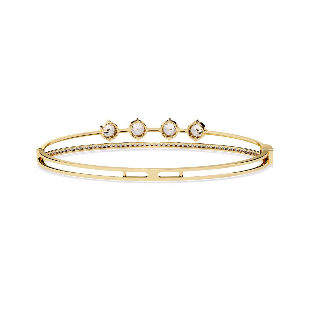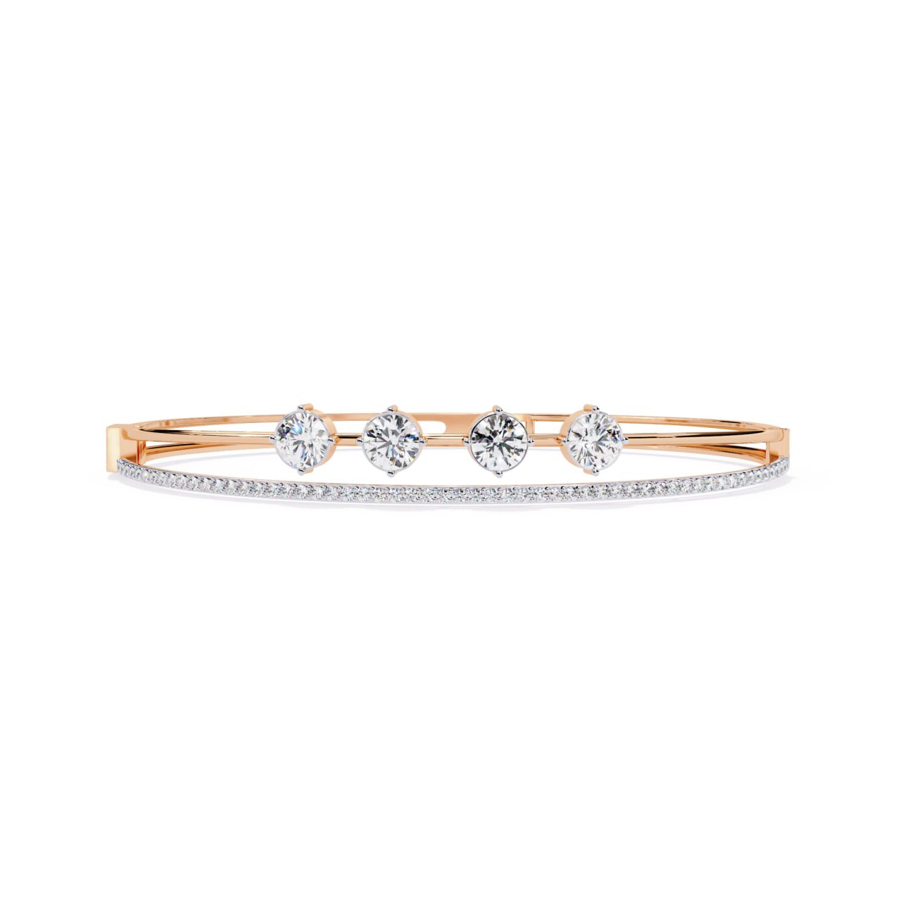 SKU : B011This Four-Stone Diamond Elegance Bracelet is a refined expression of modern luxury and minimal sophistication. Designed with four perfectly aligned round-cut diamonds at the center, the bracelet symbolizes balance, harmony, and timeless beauty. A sleek gold structure is complemented by a delicate pavé diamond strip beneath the center stones, adding subtle brilliance without overpowering the design. Crafted for everyday elegance as well as special occasions, this bracelet offers a lightweight yet premium feel, making it an ideal choice for contemporary fine jewelry lovers.