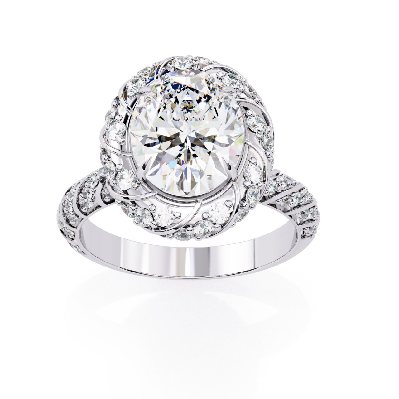 SKU : R197This luxurious vintage-inspired halo diamond ring features a stunning oval-cut center diamond, beautifully surrounded by an intricate swirl halo of round brilliant diamonds. The detailed split shank is adorned with pavé-set diamonds, adding exceptional sparkle from every angle. Crafted in polished yellow gold, this ring blends classic elegance with artistic detailing, making it a perfect choice for engagements and statement occasions.